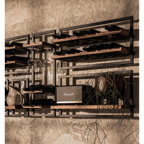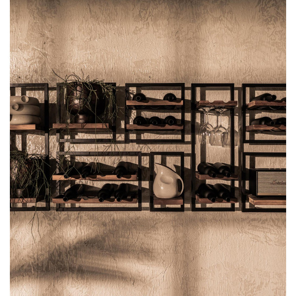 Tämä viiniteline lasipidikkeellä - Type D on käytännöllisen lisäksi ainutlaatuinen ja tyylikäs tuote suosikkiviinien ja tässä tapauksessa lasien näyttämiseen! Seinään asennettava pullonpidike on käsintehty talteenotetusta teakista ja mustasta raudasta. Ripusta se yksin tai yhdistä se toiseen Shelfmates-pullonpidikkeisiin tai hyllyihin. Kokoonpanomahdollisuudet ovat rajattomat. Tyypin D mahtuu 6 pulloa viiniä ja 4 lasia. Sen mitat ovat 25x25,5x75 cm.