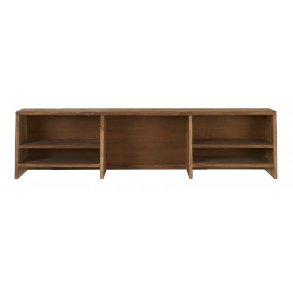 Tämä kierrätetystä tiikistä valmistettu hylly asettuu toimiston reunalle luoden toimivia ja esteettisiä säilytystiloja