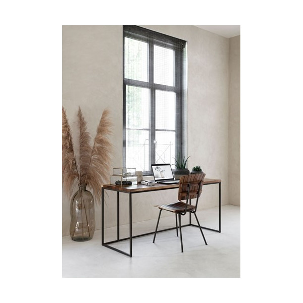 Järjestetyn työtilan luomiseksi tämä Flare-työpöytä on täydellinen. Se on valmistettu Suar-lehtipuusta ja siinä on mustat kultaiset metallijalat. Tämä 140x60x76 cm työpöytä tuo klassisen muotoilun ruskealla värillään.