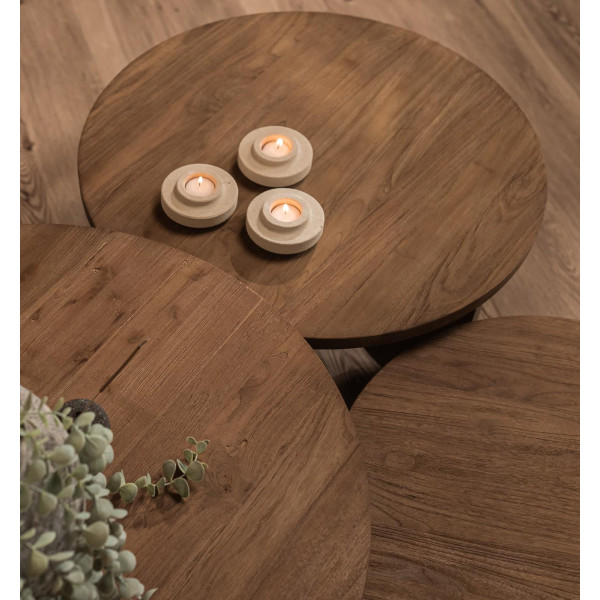 Tämä on Ace-sohvapöytä, joka koostuu kolmesta lukituksesta, joissa on ainutlaatuinen ja moderni muotoilu, tyylikkäät graafiset pinnat ja kolme erillistä jalkaa. Suunniteltu täydentämään Ace-huonekalulinjaa, näitä taulukoita voidaan käyttää tyylikkäinä keskustelupisteinä missä tahansa makuuhuoneessa tai huoneessa. Valmistettu patinoidusta, talteenotettu ja kunnostettu tiikkipuu, ne ovat myös rauhoittavia eettisen ja ympäristöystävällisen valmistuksensa vuoksi. Pöytien mitat ovat 55x65x75 cm, 55x65x75 cm ja 30x35x40 cm.