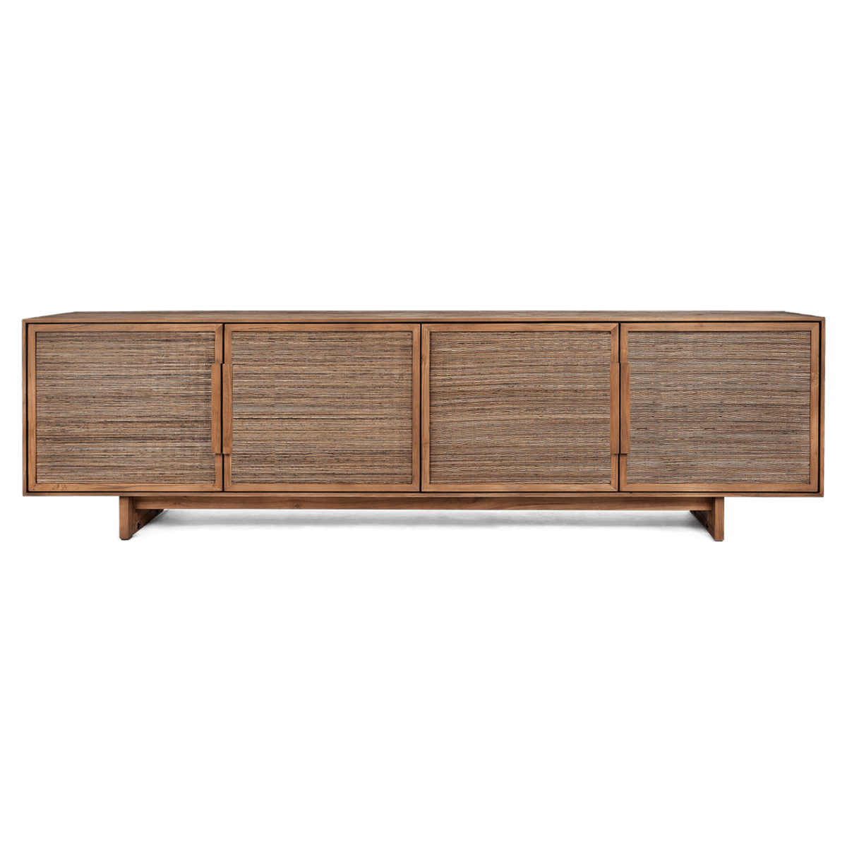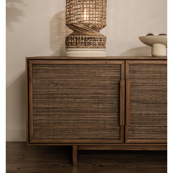 Le buffet bas avec 4 portes est un meuble élégant et spacieux, construit à la main avec des étagères amovibles. Il est composé d'une élégante armoire en teck récupéré et de portes en feuilles de cocotier tressées à la main, ornées de poignées finement travaillées. Avec son style rétro chic des années 50, il apportera une touche de sophistication à tout espace contemporain ou classique. Ses dimensions sont de 210x45x60 cm.