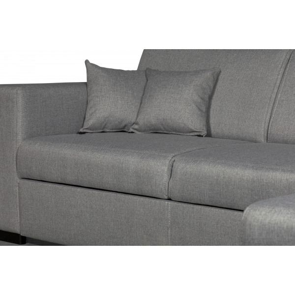 Les versions grises ont un revêtement en tissu. La version noire est en similicuir PU. Le canapé mesure 262 x 157 x 83 cm avec une assise haute de 44 cm et dense de 28 kg/m³. Le couchage fait 130 x 210 cm et est constitué d'une suspension en ressorts zig-zag.