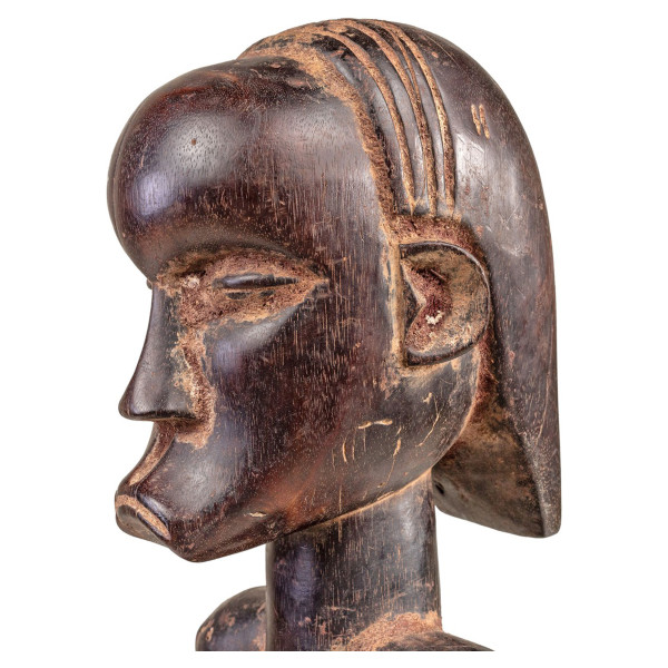 Les Fang, peuple bantou d'Afrique centrale, occupent un territoire vaste et diversifié, ce qui a donné naissance à de nombreux styles artistique. Ces figures étaient utilisées pour protéger les reliques des ancêtres, qui étaient souvent conservées dans des conteneurs en bois. Les figures étaient également consultées pour obtenir de l'aide et de la protection des ancêtres. Il a une dimension de 16x15,5x48 cm et faite entièrement en bois. C'est une pièce unique venant de Gabon et datée du milieu du 20è siècle.