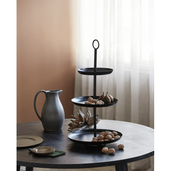 Ce plateau d’étagère Assam est un accessoire individuel et parfait comme décoration noble dans une pièce. La construction en fer avec un revêtement en poudre noire rendent ce meuble élégant sur la table. Il a une forme attrayante grâce à ses trois plateaux de rangement qui mesurent ø22/29/34x64 cm.