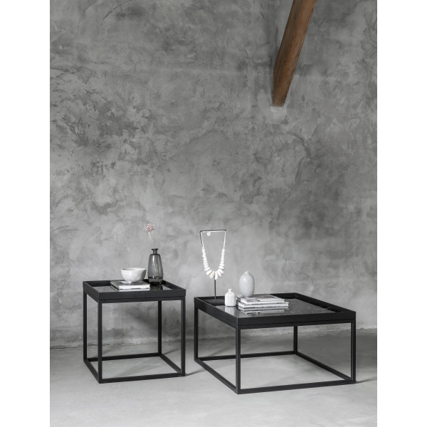La table basse MUST Living Cube existe en deux tailles. La table a un dessus en verre de marbre noir.