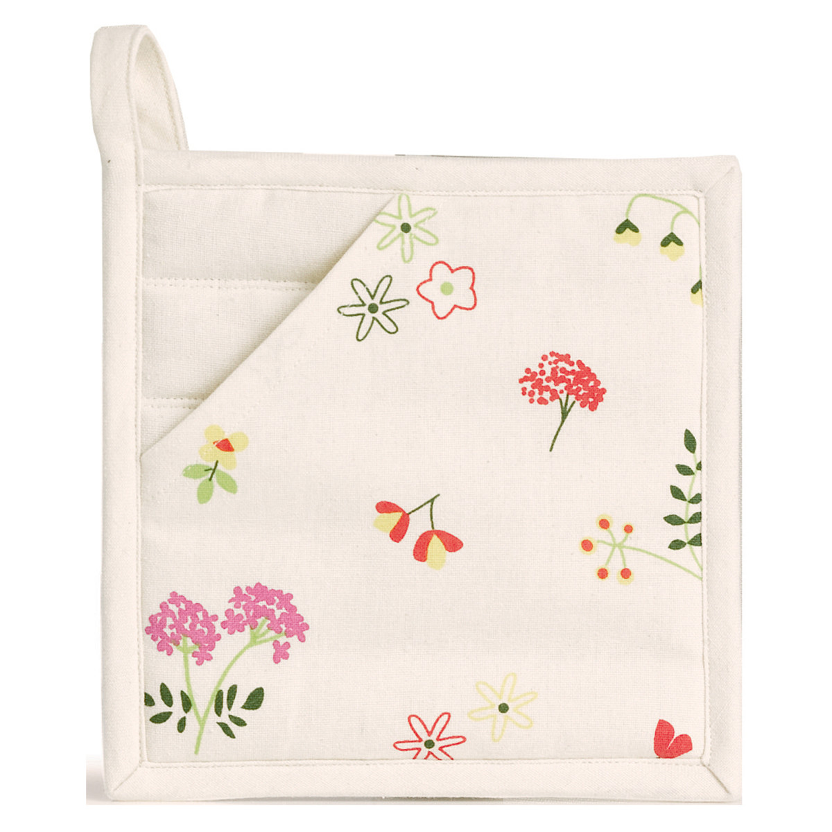 Αυτό το δοχείο Gardenia 2 σε 1 είναι κατασκευασμένο από ανακυκλωμένο βαμβάκι, βαμμένο νήμα, αποτελούμενο από 80% βαμβάκι και 20% πολυεστέρα. Επιτρέπει την ασφαλή απομάκρυνση των πιάτων από το φούρνο, ενώ φέρνει ένα άγγιγμα φρεσκάδας της άνοιξης στην κουζίνα. Το κομψό λουλουδάτο μοτίβο σε αυτό το potholder υπάρχει επίσης στην αντίστοιχη πετσέτα τσαγιού και ποδιά από την ίδια συλλογή. Οι διαστάσεις του είναι 20x20 cm και προσφέρεται σε εκρού απόχρωση.
