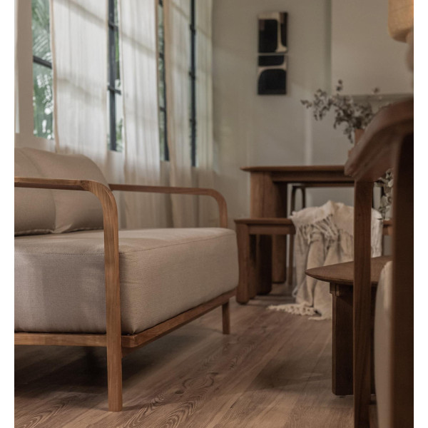 Ο διθέσιος καναπές Classy Lounge αποτελεί μια κομψή και μοντέρνα επιλογή για το σαλόνι σας ή τον χώρο χαλάρωσης. Αυτό το άνετο κάθισμα διαθέτει σχεδιασμό σε στυλ κλαμπ, με αναγεννημένα μπράτσα τικ και λεπτομέρειες πλαισίου εμπνευσμένες από το «ψαλίδια». Με μέγεθος 135,5 x 81 x 66/80 cm, αυτή η διθέσιο πολυθρόνα είναι ιδανική για να αγκαλιάσετε με έναν φίλο ή αγαπημένο σας πρόσωπο και να συνομιλήσετε άνετα απολαμβάνοντας το αγαπημένο σας ποτό. Το μαξιλάρι του καθίσματος είναι βαθιά γεμισμένο και καλυμμένο με πρακτικό μπεζ ύφασμα που μπορεί να αφαιρεθεί για εύκολο καθάρισμα. Προσθέστε μια κομψή πινελιά στο χώρο του καθιστικού σας με αυτή τη διθέσιο πολυθρόνα Classy Lounge. Αυτός ο καναπές έχει σχεδιαστεί για να είναι φιλικός προς το περιβάλλον με την ανακυκλωμένη δομή του teak και την ταπετσαρία από ανακυκλωμένο οργανικό βαμβάκι.