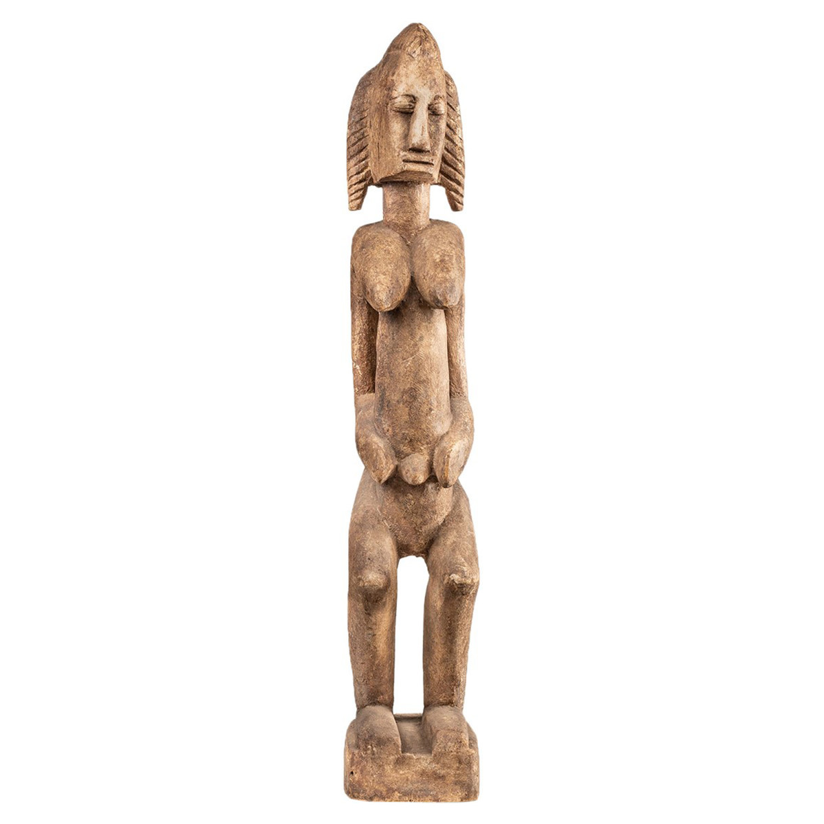 Αυτό το ειδώλιο Dyonyeni, που προέρχεται από τη φυλή Bambara στο Μάλι, είναι ένα εξαιρετικό παράδειγμα αφρικανικής τέχνης και πολιτισμού. Χρονολογείται από τα μέσα του 20ου αιώνα και έχει διαστάσεις 25x18x99 εκ. Η φιγούρα είναι σκαλισμένη από φυσικό ξύλο και αντιπροσωπεύει μια γυναικεία φιγούρα. Στέκεται με τα χέρια της σηκωμένα. Το στήθος είναι κωνικό και στρογγυλεμένο, σύμβολο γονιμότητας και ζωής. Το πρόσωπο είναι ωοειδές και αρμονικό, με μεγάλα εκφραστικά μάτια και χαμογελαστό στόμα. Τα μαλλιά είναι προσεκτικά σχεδιασμένα. Είναι σύμβολο γονιμότητας, ζωής και ευημερίας.