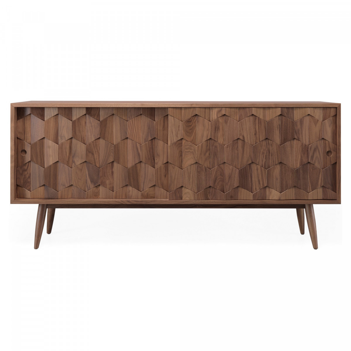 Ο μπουφές Scarpa προσφέρει έναν μοναδικό σχεδιασμό, με δύο συρτάρια και τέσσερις χώρους. Οι δύο συρόμενες πόρτες είναι φτιαγμένες από κομμάτια ξύλου τοποθετημένα με τέτοιο τρόπο ώστε να δημιουργούν ένα δυναμικό και τρισδιάστατο μοτίβο. Αυτό το έπιπλο από μασίφ ξύλο καρυδιάς της μάρκας Wewood έχει διαστάσεις 186x45x84 εκ.