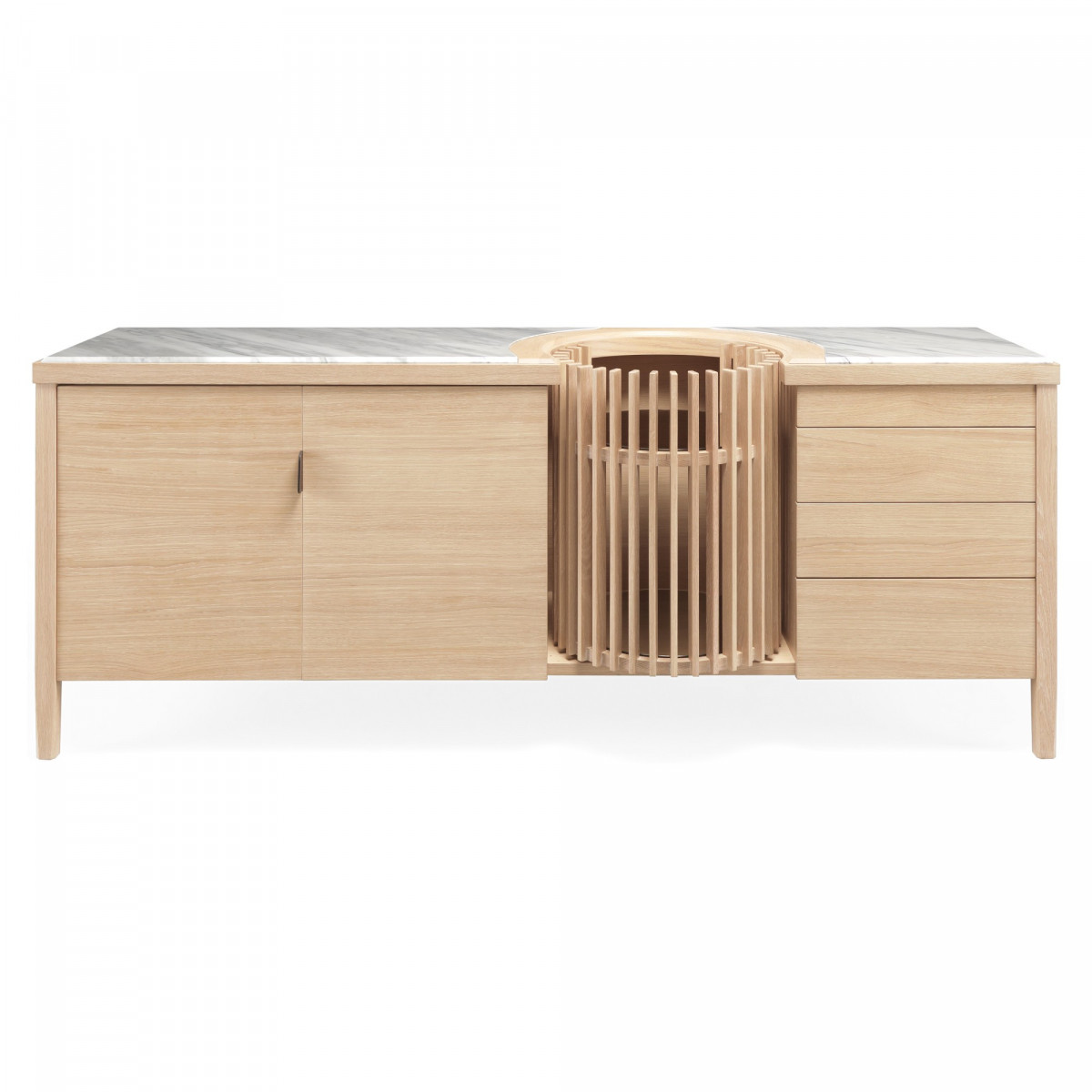 Το Carousel είναι ένας κομψός μπουφές που συνδυάζει ευγενές μασίφ ξύλο δρυός και μάρμαρο. Διαθέτει δύο πτυσσόμενες πόρτες με εσωτερικά ξύλινα ράφια και τέσσερα συρτάρια με σύστημα tic-tac. Το πρωτότυπο σημείο του είναι το περιστρεφόμενο μέρος στη μέση που μπορεί να χρησιμοποιηθεί για να τοποθετήσετε μπουκάλια και ποτήρια. Αυτό το έπιπλο του σχεδιαστή Leonhard Pfeifer και της μάρκας Wewood έχει διαστάσεις 205x50x81 εκ.
