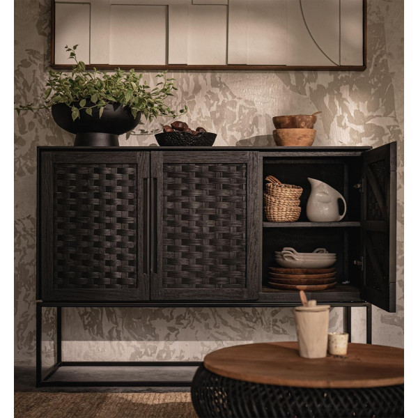 Αυτός ο μπουφές Karma με 3 πόρτες είναι μια όμορφη αποθηκευτική μονάδα από τη συλλογή μας Karma. Αυτό το κομμάτι με κάρβουνο γίνεται με διάφορες τεχνικές βιοτεχνίας. Είναι χειροποίητο από ξύλο αναγεννημένο και έχει σιδερένιο πλαίσιο καθώς και πόρτες από ραττάν που είναι υφασμένα στο χέρι και έχουν φινίρισμα σε μαύρο ματ. Με τις πόρτες του κλειστές, το Karma Dresser δεν είναι μόνο κομψό, αλλά και ιδανικό για την αποθήκευση των τιμαλφών σας. Οι διαστάσεις του είναι 140x45x100 εκ.