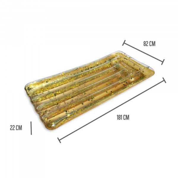 Χρειάζεστε μια στιγμή χαλάρωσης; Το φουσκωτό στρώμα με χρυσές πούλιες προσφέρει μια κομψή και άνετη στιγμή χαλάρωσης στην πισίνα. Κατασκευασμένο από PVC, αυτό το πρωτότυπο φουσκωτό στρώμα έχει διαστάσεις 22x181x82 cm.