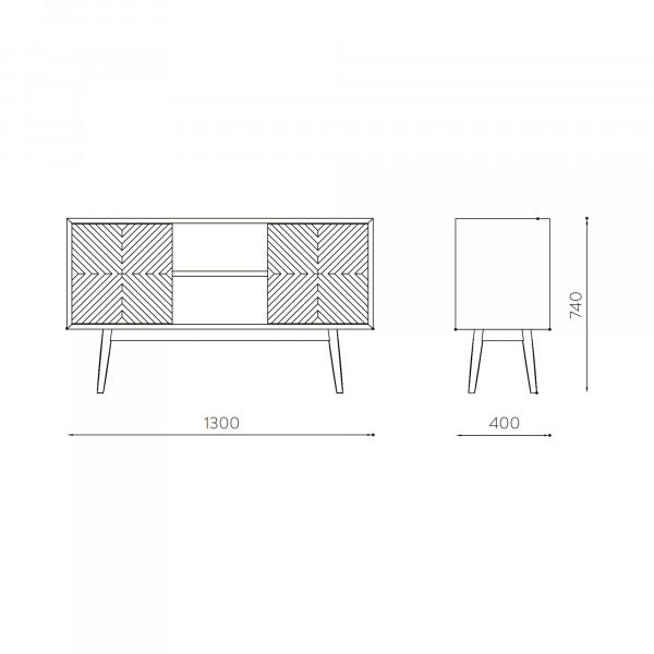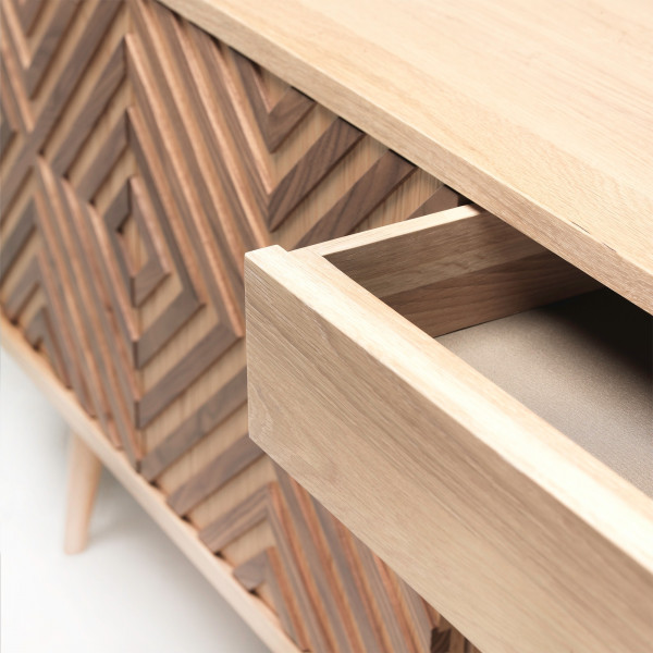 Buffet Casanova ima pet prostora: dva ormarića s kliznim vratima, dvije ladice i jedan prostor s podesivom policom, pružajući prostor za pohranu. Uzorak na vratima izrađen je od komadića hrasta i oraha ručno pričvršćenih. Ovaj masivni drveni buffet marke Wewood dimenzija je 130x40x74 cm.