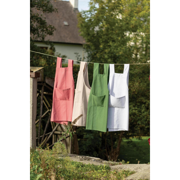 Ova Gen kuhinjska pregača donosi stil i udobnost u kuhinju. Izrađen je od 80% recikliranog obojenog tkanog pamuka od ostataka i 20% poliestera. Jednostavan za održavanje, lako je strojno pranje do 40°C. Širok raspon svijetlih boja dostupan je za osvjetljavanje kuhinje prema vašem izboru.