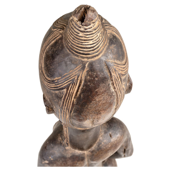 Ovaj izuzetni kip, dio predaka naroda Sénoufo na Obali Slonovače, sačuvan je u svetištu. Koristi se tijekom posebnih ceremonija, poput pogrebnih procesija, predstavlja Majku pretka. Ukrašene detaljnom frizurom i oznakama tijela, njezine stožaste grudi simboliziraju idealnu ženstvenost, dok je duge ruke predstavljaju kao moćnog čuvara. Ovaj jedinstveni komad prirodnog drveta iz 20. stoljeća mjeri 19,5x19x71 cm, hvatajući snagu i gracioznost tradicije