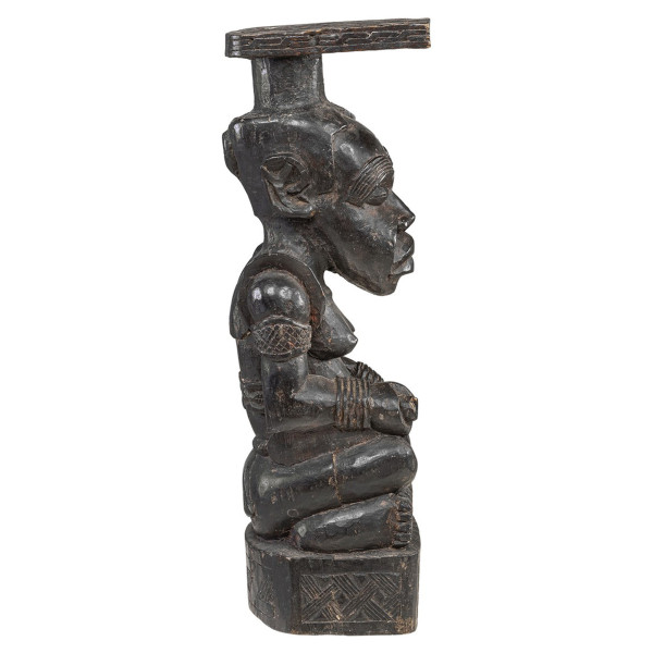 Riječ je o drvenoj figuri muškog kralja Ndopa, koji sjedi prekriženih nogu na kvadratnoj platformi (yiing) ukrašenoj prikazom puzave loze. Kipovi Ndopa idealizirani su prikazi Nyimija, kralja kraljevstva Kuba. Ova jedinstvena skulptura iz DR Konga datira iz sredine 20. stoljeća i ima dimenzije 16,5x15x50 cm.
