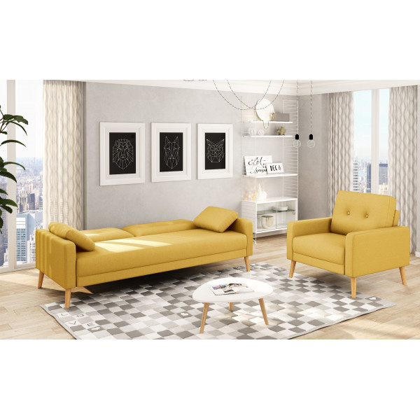 Trosjed Diana u skandinavskom stilu idealan je za male prostore. Nudi suvremeni dizajn s presvlakom od tkanine, prošivenim naslonom i drvenim nogama. Ova skandinavska klupa omogućuje jednostavnu transformaciju iz dnevnog boravka u prostor za spavanje za jednu ili dvije osobe zahvaljujući svom preklopnom naslonu. Njegova raznolikost u suptilnim ili živopisnim bojama omogućit će vam da točno odaberete stil koji želite dati svom interijeru. Dva jastuka u istoj boji dolaze s kaučem za još veću udobnost.