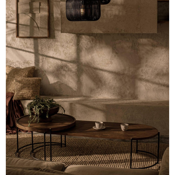 Komplet stolića Coco Eclipse od 2 elegantan je i moderan set koji se sastoji od prekrasnog ovalnog stola s podignutim rubom, izrađenog od vrhunske kvalitete tikovine, a na tradicionalan način rade naši vješti obrtnici. Tanak crni željezni okvir s mesinganim detaljima na vrhu nadopunjuje suvremeni izgled stola. Svojim sofisticiranim dizajnom i izuzetnom kvalitetom, ovaj set stolića savršen je za dodavanje dašak stila vašoj dnevnoj sobi.