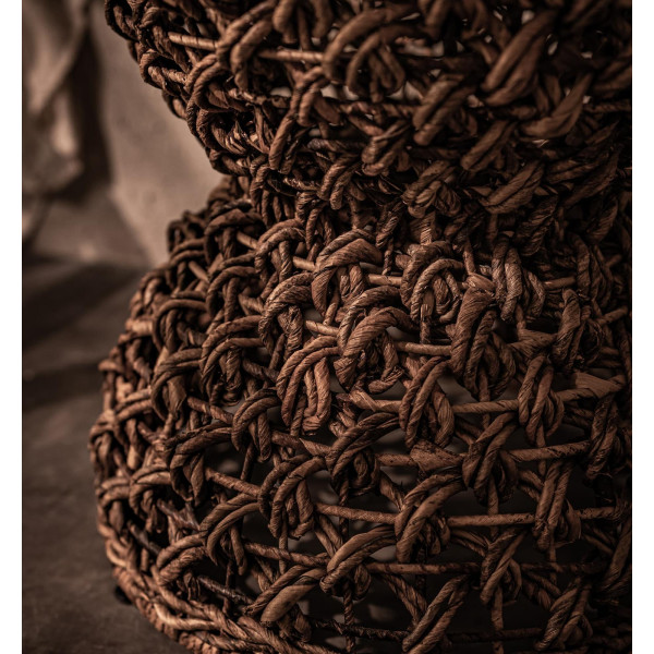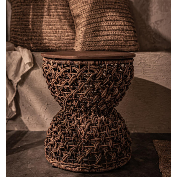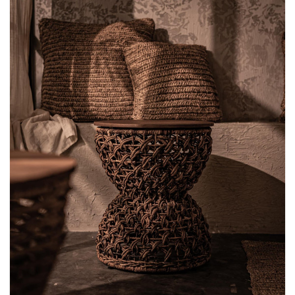 Rebana Sopran je svestrana stolica u obliku bubnja koja se može koristiti kao sjedalo, stolić za kavu ili za ukras, ovisno o željama. Njegova površina izrađena je od visokokvalitetnog obnovljenog tikovine, a okvir je izrađen od čvrste žice, potpuno umotane u organsko uže od abake, ručno rađen drevnom javanskom tehnikom. S dimenzijama 40 x 40 x 46,5 cm, ova stolica savršena je za dodavanje rustikalnog i egzotičnog dodira vašem domu.