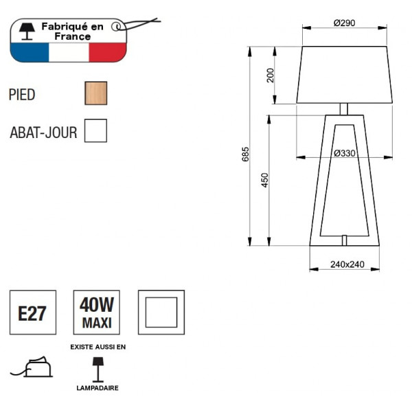 A skandináv trendek által inspirált, világos fa lábú Sacha LT lámpa bármilyen belső térben megtalálja a helyét. A lámpa természetes fa keresztlábakkal és chintz lámpaernyővel rendelkezik. E27-es izzóval működik, amelyet nem tartalmaz a csomag. Az anyagok acél, fa és kasírozott szövet. A termék Franciaországban készült.
