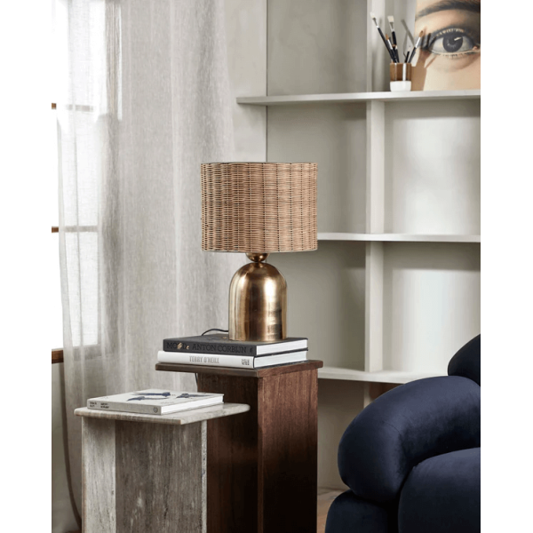 Egyszerű és hatékony, a Basti asztali lámpa csodálatos megjelenésű, és a nappalit világos és meleg helyiséggé alakítja. Arany alumínium talppal rendelkezik, arany sárgaréz kivitelben és rattan lámpaernyővel. Méretei ø33x51cm.