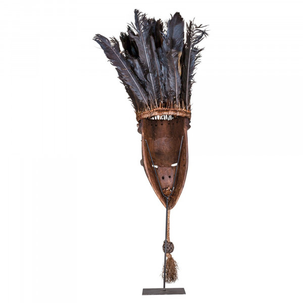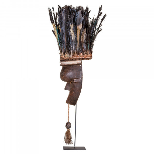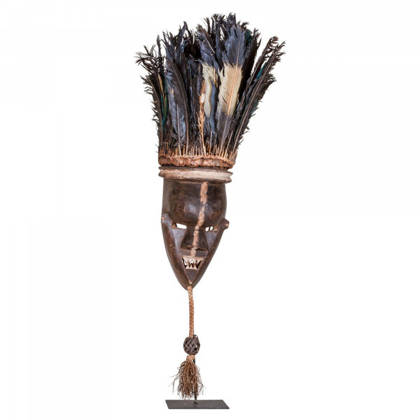 Eza lenyűgöző AAA1075 Mukinka maszk egy igazi afrikai művészet Zaire-ből a 20. századból. Ideális antik és etnikai szoba falainak díszítésére. Ez a dekoratív tárgy egyedülálló a természetes fából faragott és kötéllel ellátott tollakkal koronázott anyagainak köszönhetően. Ezt a maszkot temetésekre vagy fontos szertartásokra használják. Ez a szép Mukinka dísz mérete 41x37x98 cm.