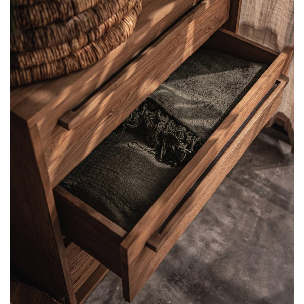 Ez a három fiókkal ellátott vázlatos szekrény egy modern szekrény, tiszta és egyszerű kialakítással, amely könnyen illeszkedik bármilyen belső stílushoz. Ez a komód kézzel készített, visszanyert teakfából készült, és minimalista kialakítású vas lábakkal rendelkezik. Három tágas fiókkal van felszerelve, amelyek minden tárolási igényt kielégítenek. Méretei 84x42,5x85 cm.