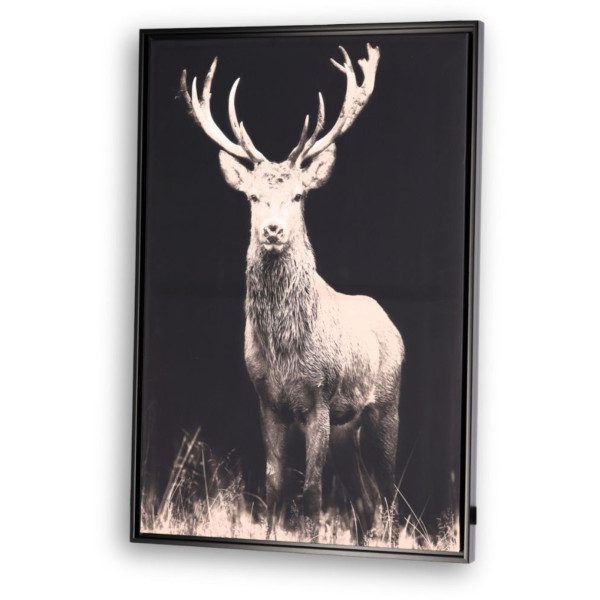 Ez a fenséges szarvast ábrázoló kép 100% poliészter vászonra van nyomtatva, és fenyőfa keretbe foglalva. A vászon egy fa keretre van rögzítve, így egy szép és nagy benyomást kelt. A kép fekete háttere kiemeli a szarvas tekintélyes megjelenését. Ez a faldekoráció tökéletesen illik egy vidéki, modern vagy dizájnos környezetbe. Könnyen rögzíthető, ez a szép ábrázolás feldobja az előszobát, a nappalit vagy az étkezőt. A kép két különböző méretben kapható.