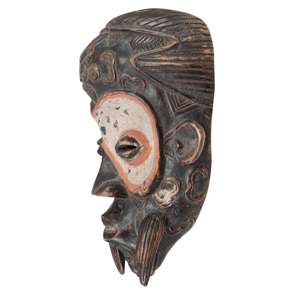 Ez a vékony Lulua-stílusú maszk jellegzetes esztétikával rendelkezik, széles oldalakkal borítja a táncos egész arcát. A felületet a Lulua kultúrára jellemző tetoválási minták díszítik, amelyeket inkább alkalmaztak, mint gravíroztak. A széles, hegyes homlok, kiemelkedő szemek, felfordult orr és ovális száj magával ragadó művészi kifejezést kölcsönöz. Az állától nyúló kis szakállak növelik az eleganciát. A szem területét szürke és vörös kaolian hangsúlyozza. Ez az egyedülálló 17,5x25x38,5 cm-es darab, teljes egészében természetes fából készült, eredetileg Kongói Demokratikus Köztársaságból származik, és a 20. századból származik.