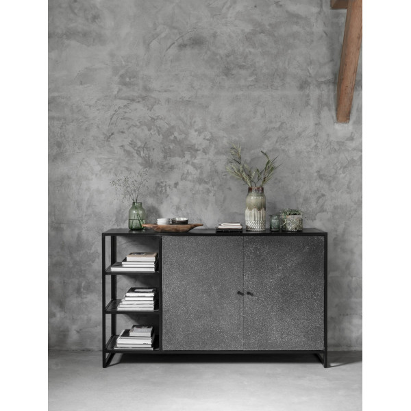 A MUST Living Mont Ventoux tálalószekrény mérete 150x45x92 cm, és fekete fém szerkezettel rendelkezik. A polcok sötét bazaltból készültek.