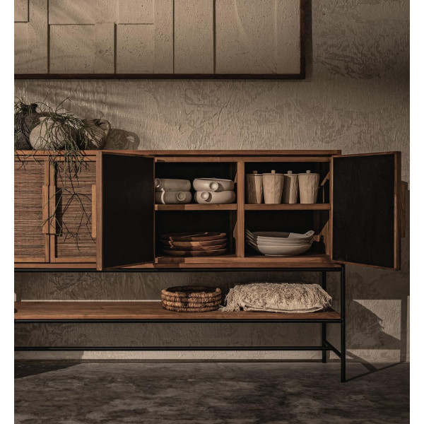 A 4 ajtós és 1 polccal ellátott Coco tálalószekrény újrahasznosított teakfából, vasból és szövött szövetből készült bútordarab, amelyet kézzel készítettek a kókuszlevél központi bordájából. Téglalap alakú, ez egy igazi remekmű, amely azonnal elkapja a szemet. Négy ajtóval és nyitott polccal az egység nagyon sokoldalú. A fakeret enyhe szöge növeli egyedi megjelenését. A méretek 170x40x100 cm.