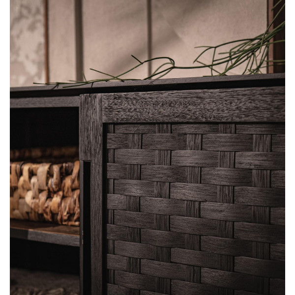 Ez a 3 ajtós Karma tálalószekrény egy gyönyörű bútor, amely része a Karma kollekciónknak. Ez a háromajtós szekrény különféle kézműves technikákkal készült. Kézzel újrahasznosított fából készült, vas lábakkal és gyönyörűen strukturált, kézzel szőtt rattan fiókokkal rendelkezik. Lábának játékos helyzete egy kis évjáratot kölcsönöz a század közepének ihlette dizájnnak. A 151x40x75 cm méretű komód tökéletesen alkalmas ruhák és kiegészítők elegáns és praktikus tárolására.