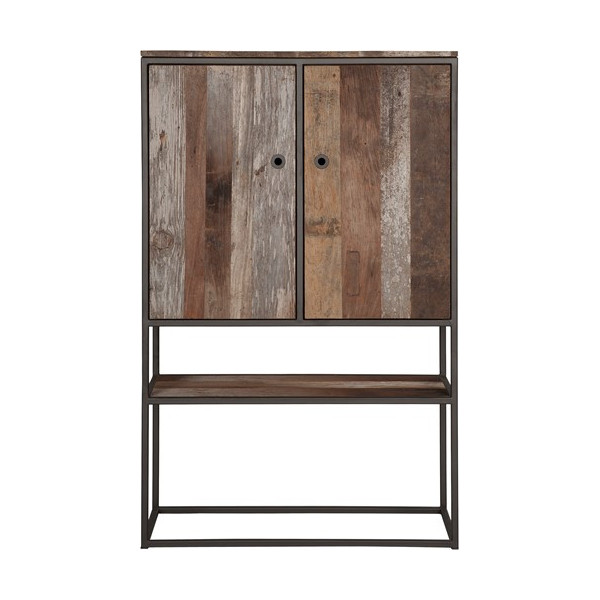Szekrény fekete fém kerettel és újrahasznosított tikfával, amelyen színmaradványok sejlenek át.