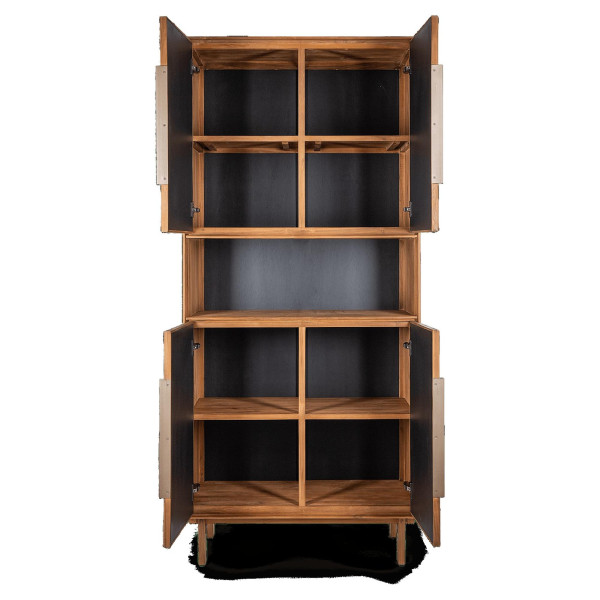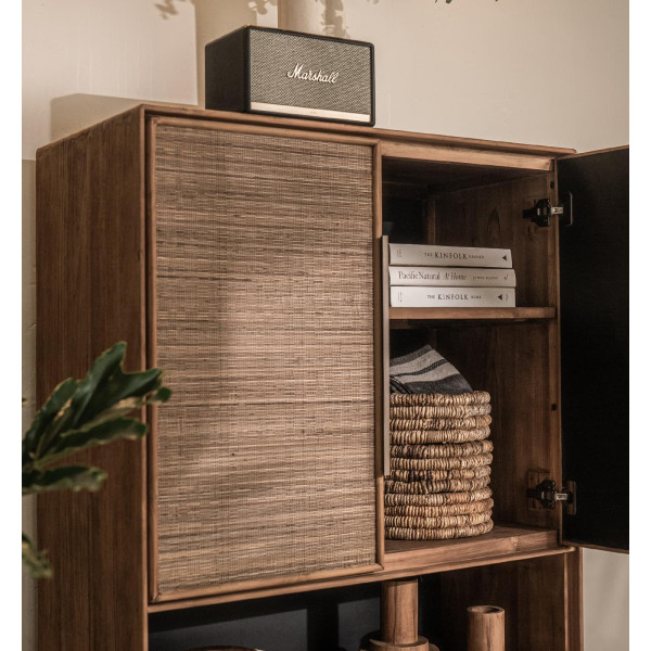 Nagy és elegáns, retro stílusával, a Grace szekrény praktikus és sokoldalú. Újrahasznosított teakből készült, négy ajtaját gyönyörűen tapintható borítja, borda közepére szőtt kókuszlevelek, gyöngy teak és elegáns kontúrozott sárgaréz fogantyúkkal keretezve. Ez a tárolóegység mérete 90x45x200 cm.