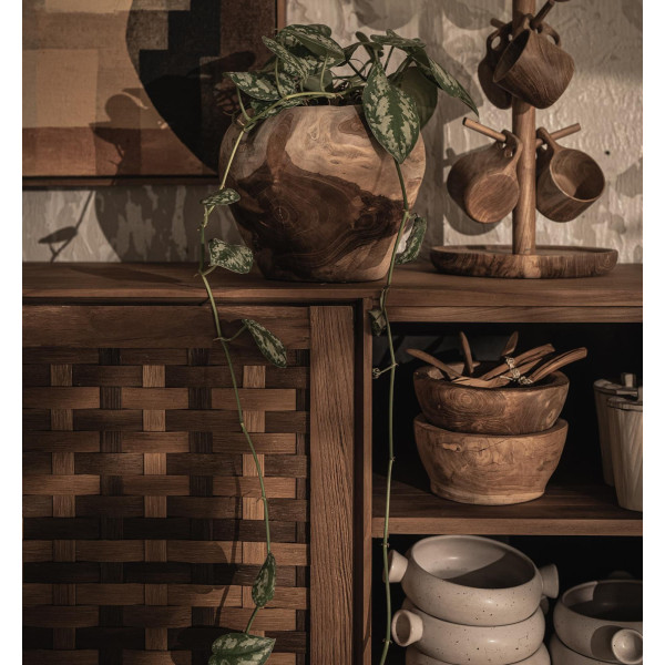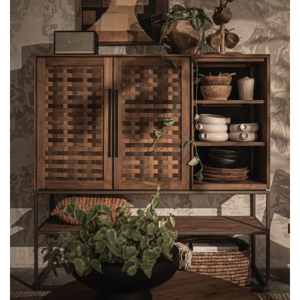 Ez a Karma szekrénymodell 2 ajtóból, 3 fiókból és 1 nyitott állványból áll. Ez a szekrény egy kézműves bútordarab újrahasznosított teakból, vaskerettel, speciális sárgaréz matt felülettel. Két kézzel szőtt, természetes színű teak ajtóval, valamint három polccal rendelkezik kedvenc kincseinek megjelenítéséhez. A többi holmija könnyen tárolható a gyönyörűen felépített ajtók mögött. A 140x45x140 cm méretű szekrény egyszerre nagy és gyönyörű, tökéletes arra, hogy otthonának bármely szobájához stílust adjon.