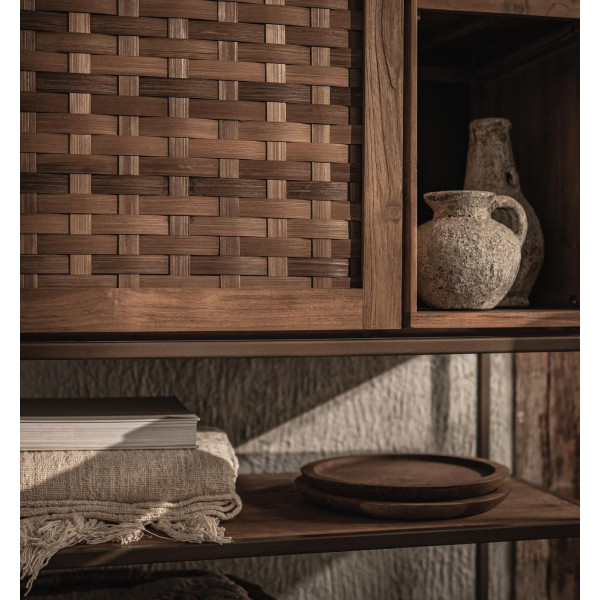 A Karma Pure Cabinet elegáns és multifunkcionális bútordarab, kézzel készített újrahasznosított teakból. Nyitott állványa van, három nyitott polc, és egy gyönyörű ajtó, amely kézzel szőtt teakből van felépítve. A visszanyert teak természetes színei, a matt sárgaréz kivitelű vaskerettel kombinálva gazdag ipari vintage megjelenést kölcsönöznek a bútoroknak. Méretei 90x45x180 cm.