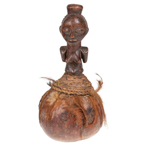 kalabászok, amelyeket gyakran szent edényként használnak, gyógyszereket és olajokat tárolnak különböző emberek kezében. Finoman faragott fából készült dugókkal felszerelve ezek a miniatűr fejek nagyobb szobrokat és maszkokat utánozzák. Ez a 14x12,5x27 cm méretű 20. századi tök és tollfa darab, amely eredetileg a Kongói Demokratikus Köztársaságban található Louba törzsből származik, tükrözi a régió kulturális és lelki gazdagságát.