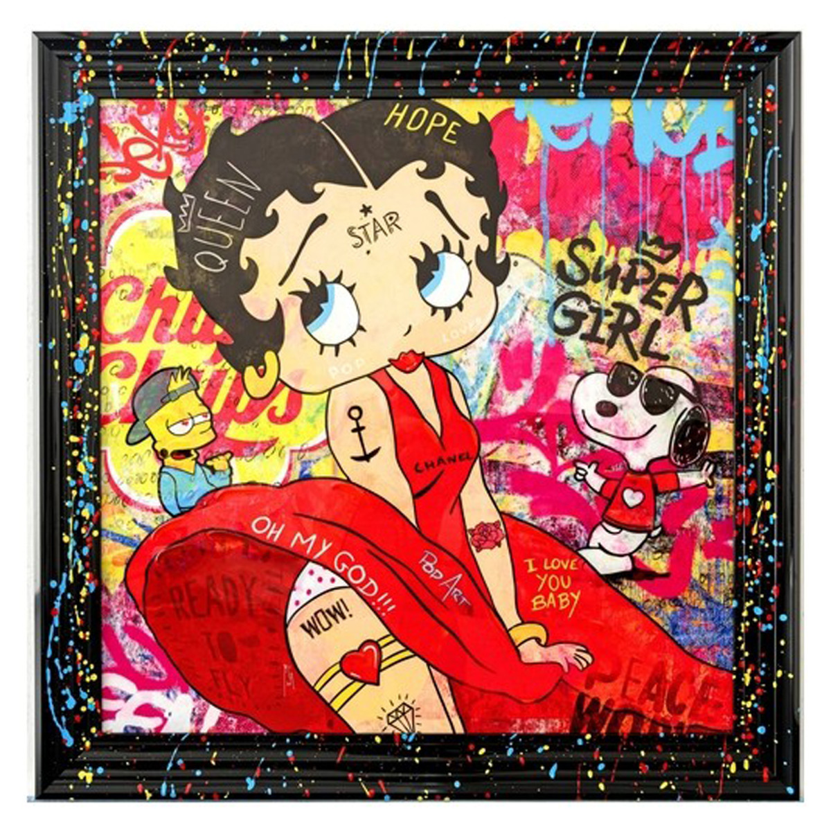 The 80x80 cm framed painting features a modern and bold representation of the famous animation icon Betty Boop. In this contemporary version, she is depicted with her iconic red dress and big eyes evoking innocence, but with modern additions such as signature tattoos and taglines like “Hope,” “Star,” and “Super Girl,” which give the image an air of feminine power. Alongside him, contemporary cartoon characters provide a comical and playful contrast. The background and frame are splattered with multi-colored paint, reflecting an energetic blend of tradition and current pop culture.