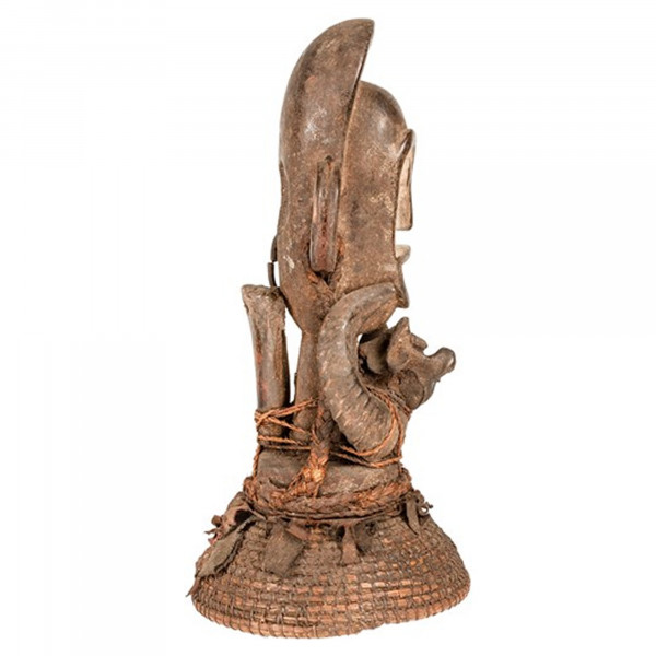 The Versmissen Boa War Mask is the perfect accessory for an antique ethnic wall decoration. This item is unique and original thanks to its natural wood finish with horn and bone. The classic Boa mask is used by a sorcerer in front of troops to scare and flee enemies. This antique product dated to the 20th century has a dimension of 22x22x42 cm.