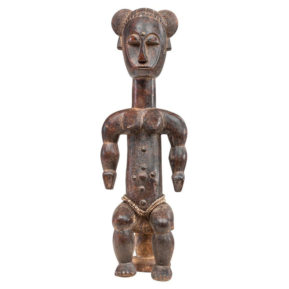 Attye Lagoon female figures are renowned for their striking beauty and their ritual use to promote fertility, a tradition shared by many peoples living along the lagoon. However, what sets Attye figures apart are the scarification marks on the neck and abdomen, often created by inserting small wooden plugs rather than sculpting them in relief. This unique piece of natural wood from Ivory Coast, beads and nails, measures 13x14.5x47 cm. She embodies the cultural wealth of the Attyes and their sense of aesthetics, while carrying the symbolism of fertility. This sculpture is originally from the Ivory Coast and dates from the middle of the 20th century.