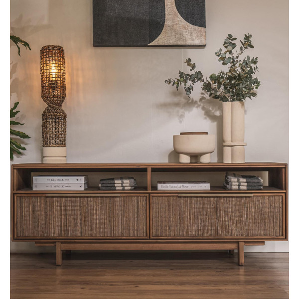 The elegant Grace dresser is available in three sizes. This teak piece of furniture mounted on a short pedestal contains two front drawers, covered with medium-ribbed woven coconut leaves, a pearl teak structure with elegant profiled brass handles, as well as an open alcove and an upper shelf. This authentic piece of solid wood furniture adds a convivial touch to the interior design.