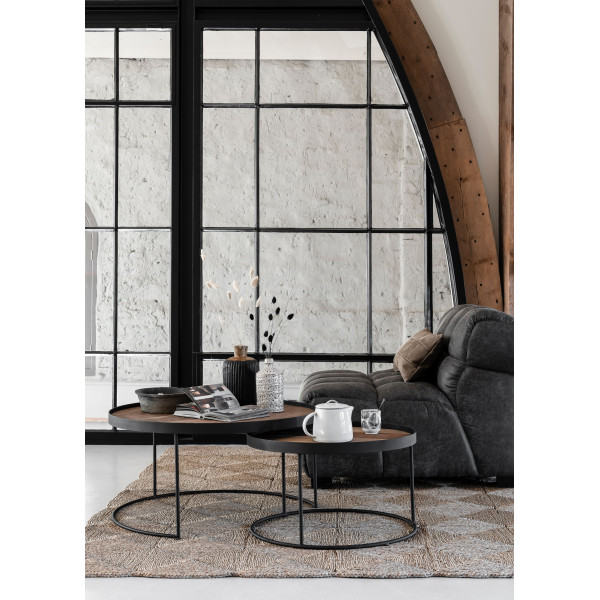 Mercurius is a set of 2 coffee tables. The tables have a round shape and are made of wood with an iron frame. They measure Ø60x35 cm and Ø80x40 cm and are available in two colors.