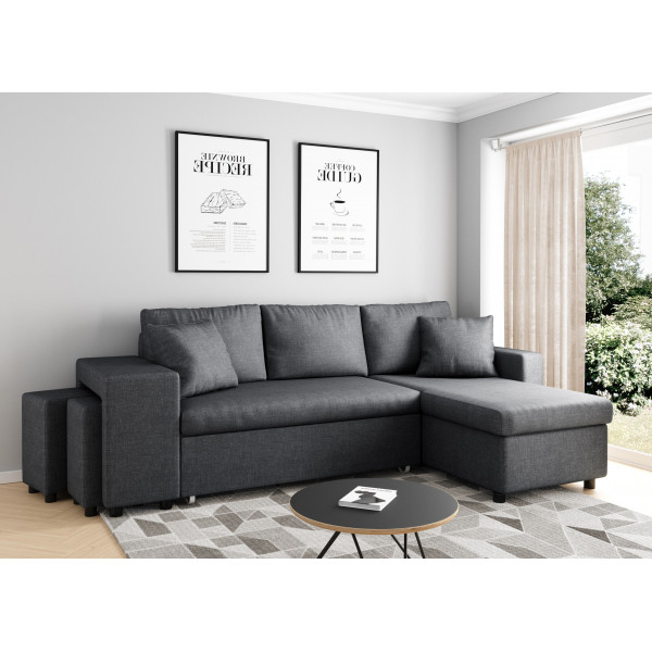 With its sleek and timeless design, this large corner sofa will easily fit into any interior. It offers multiple functions: a large storage compartment, a convertible bed function, a reversible chaise lounge that allows you to adjust your sofa and living room to your liking, and a non-reversible (fixed) niche serving as a wide armrest that can accommodate 2 poufs to provide 2 additional seats. It's the ideal sofa for hosting friends and family! Its various upholstery and color options will allow you to choose the exact style that matches your interior. Two matching small cushions are included. The seat has a density of 27 kg/m³. The Maria Plus sofa has a fabric cover and measures 241x86/146x82.5 cm as a sofa and 140x190 cm as a bed.