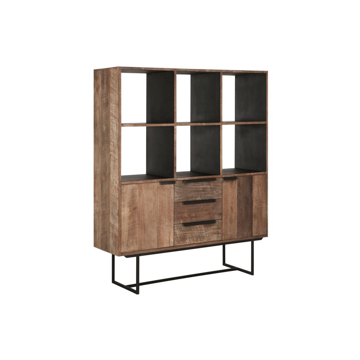 The Odeon bookshelf is made of teak wood and has a black metal frame. The bookshelf measures 140x45x168 cm and has 2 doors, 3 drawers, and 6 open shelves.