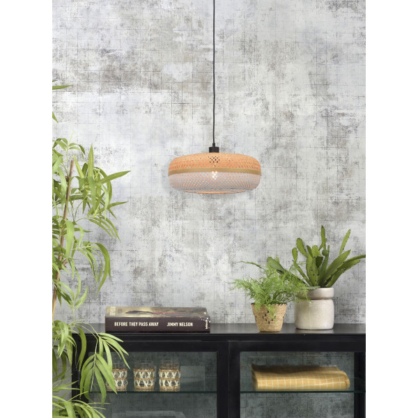 Combining iron and bamboo, the Palawan pendant lamp adds an exotic touch to an interior decoration. This luminaire creates a play of shadow and delicate light to make a living room or kitchen even more user-friendly. It is characterized by a length of 40-60 cm, a height of 15 to 200 cm as well as a base size of 11 cm in diameter and 4 cm thick. This luminaire has an E27 base (bulb not included).
