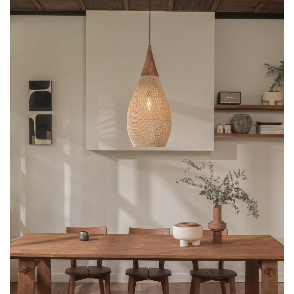 This brilliant Horn pendant light is a beautiful fixture for small rooms, but it can also be perfectly combined with one of the lampshades from the series to create a decorative group of pendants above the dining table. The organically shaped rattan weave is carefully handcrafted using a traditional Javanese technique. Available in different sizes and in natural or charcoal finish.