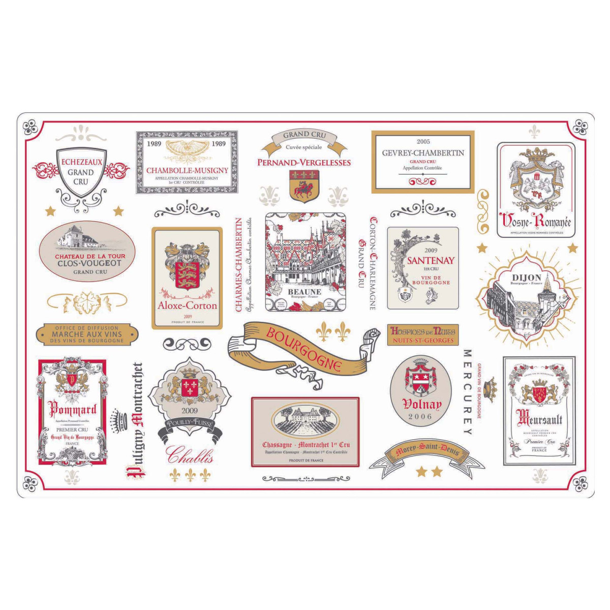 The Burgundy placemat set is both a practical and decorative table accessory. It is made from polypropylene, a durable and easy-to-maintain material. The Burgundy placemat set is perfect for protecting the table while adding a decorative touch. The design of the placemat is inspired by the great wines of Burgundy. It features an illustration of these wines, showcasing their labels and iconic colors. The Burgundy placemat set is an excellent choice for those seeking a functional and decorative table accessory. It is also available with a hanging loop for easy suspension. This item measures 30x45 cm and is sold in a set of 6.