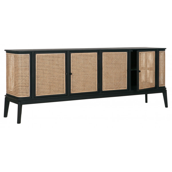 The large Raffles sideboard features both a retro look and a natural style mixed with modernity. This piece of furniture has a Mindi wood structure and rattan panels. It measures 213x48x80 cm and has 4 doors.