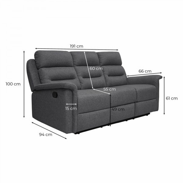 This 3 seater relaxation sofa is the ideal assembly for moments of perfect relaxation in an interior. Thanks to the manual operation, the two seats at each end of the sofa can be tilted into relaxation mode by raising the footrest and reclining the backrest by 170°. Fully lined with foam, this sofa offers unparalleled comfort. 9222 is made from wood and plywood and covered entirely with fabric with foam filling. It's the perfect couch for lounging, dozing off, reading or watching TV. The sofa has dimensions of 94x191x100 cm with a seat height of 49 cm. Thus, it comes in several colors.