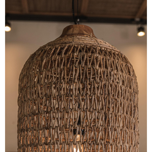 The Brandy Wing pendant has a unique lampshade. Made from a metal frame, this lampshade is cleverly wrapped in abaca bark to create a rustic and pleasant woven appearance. The lamp is then topped by a crest of reclaimed teak, turned by hand. The light diffused through the lampshade creates a beautiful lattice glow on surfaces and walls, adding a touch of elegance to any room or home. The Brandy Wing lamp shade collection enhances the ambiance of any